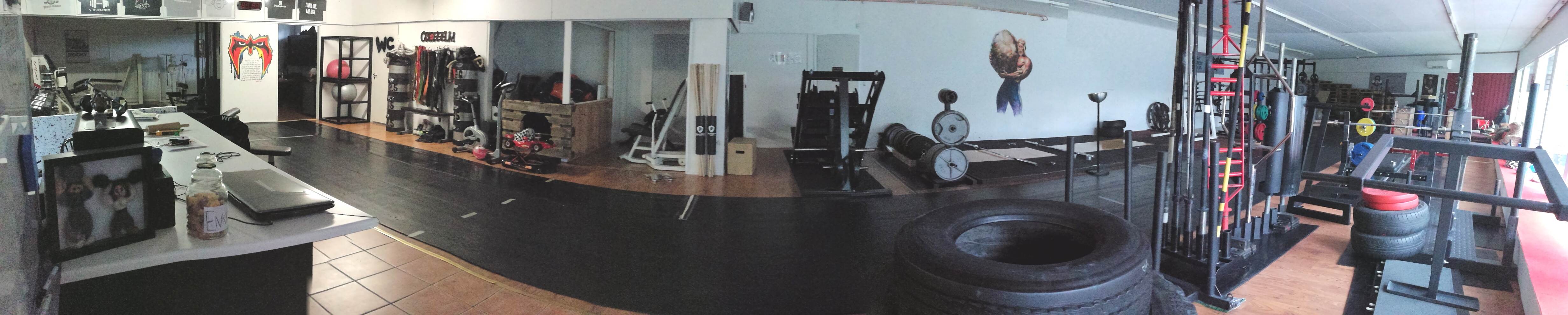 Sitten päästäänkin kolmanteen ja suurimpaan, arviolta 200 neliön avonaiseen tilaan. Lähdetään liikkeelle siitä mihin äskeiset huoneet loppuvat. Tilan halkaisee päästä päähän kulkeva parin metrin levyinen ja reilun 20 metrin pituinen voimamiesrata. Oikealle puolelle jää käsipaino nurkkaus josta löytyy käsipainot 1-50kg, scottipenkki hauiskääntöön sekä pari kappaletta säädettäviä penkkejä. Vastaavasti vasemmalta puolelta tilaa löytyy 8 pientä eripainoista kaljatynnyriä heittelyjä varten, pitkiä vetokumeja 6 eri vahvuudella vähintäänkin yksi pari jokaista sekä lyhkäsempiä kumeja parilla eri vahvuudella. Kumien vieressä roikkuu erilaisia vöitä voimanostovöistä, dippi-, painonnosto- ja neopreenivöihin, jotka ovat salin asiakkaiden vapaassa käytössä. Nurkasta löytyy vielä silver dollar-maastavetoa varten tarvittavat boksit sekä 20m paksu köysi niin rekanvetoa kuin battle rope käyttöä varten. Niin ja kun sitä rekkaa ei sisälle mahdu niin tätä lajia varten löytyy siihen kehitetty simulaattori.