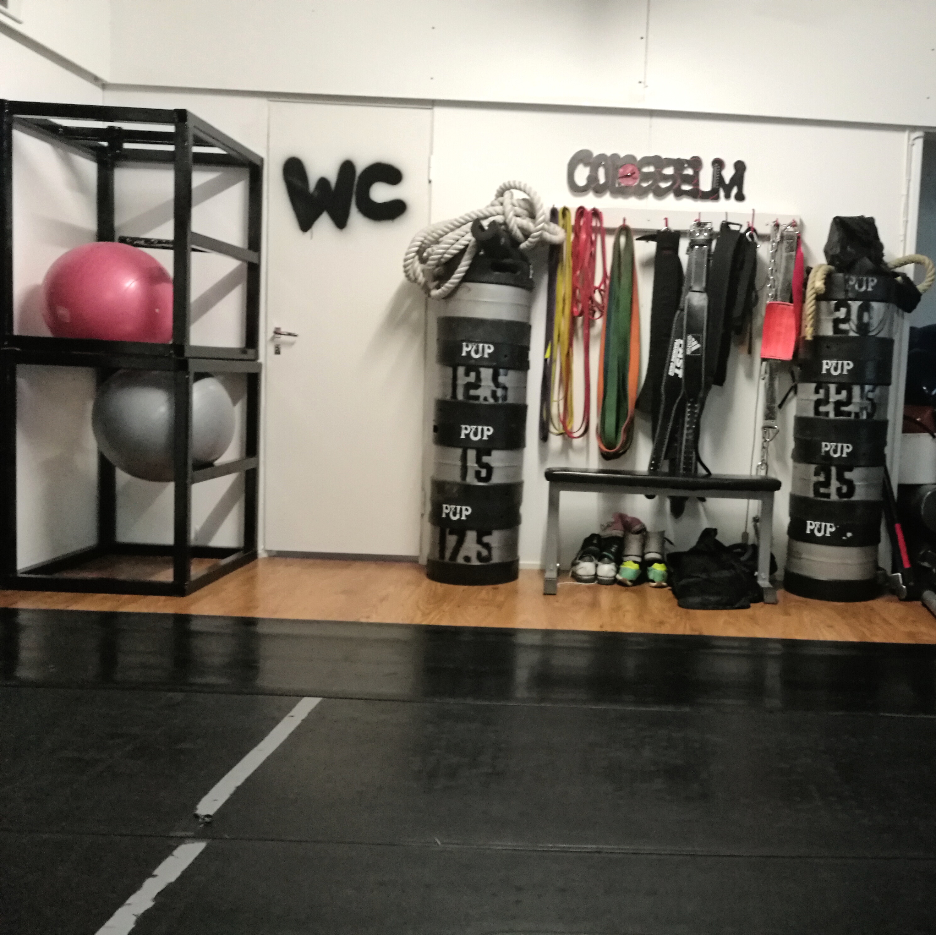 Jatketaan matkaa eteenpäin niin vasemmalle jää pieni varastotila, josta löytyy hercules holdia tai jättiläisen sormia varten pylväät sekä auton maastavetokehikko, selänojennuspenkki kuin myös pari Avancian laitetta lisää, tällä kertaa rintapunnerrus ja rintatuettu soutu istuen sekä HC GYMin jalkaprässi/hack kyykky-yhdistelmä. Vasemmalla puolella suurin piirtein samassa kohtaa löytyy kaksi pienempää rengasta, joiden painot ovat noin 70 ja 200 kiloa. Lisää ja isompia renkaita löytyy ulkoa. Renkaiden jälkeen tulee kuuden lajin voimamieslaite, joka on viikinkipunnerrus-asennossa. Tällä laitteella onnistuu mm. jo edellä mainittu hercules hold sekä conan-kävelykin.