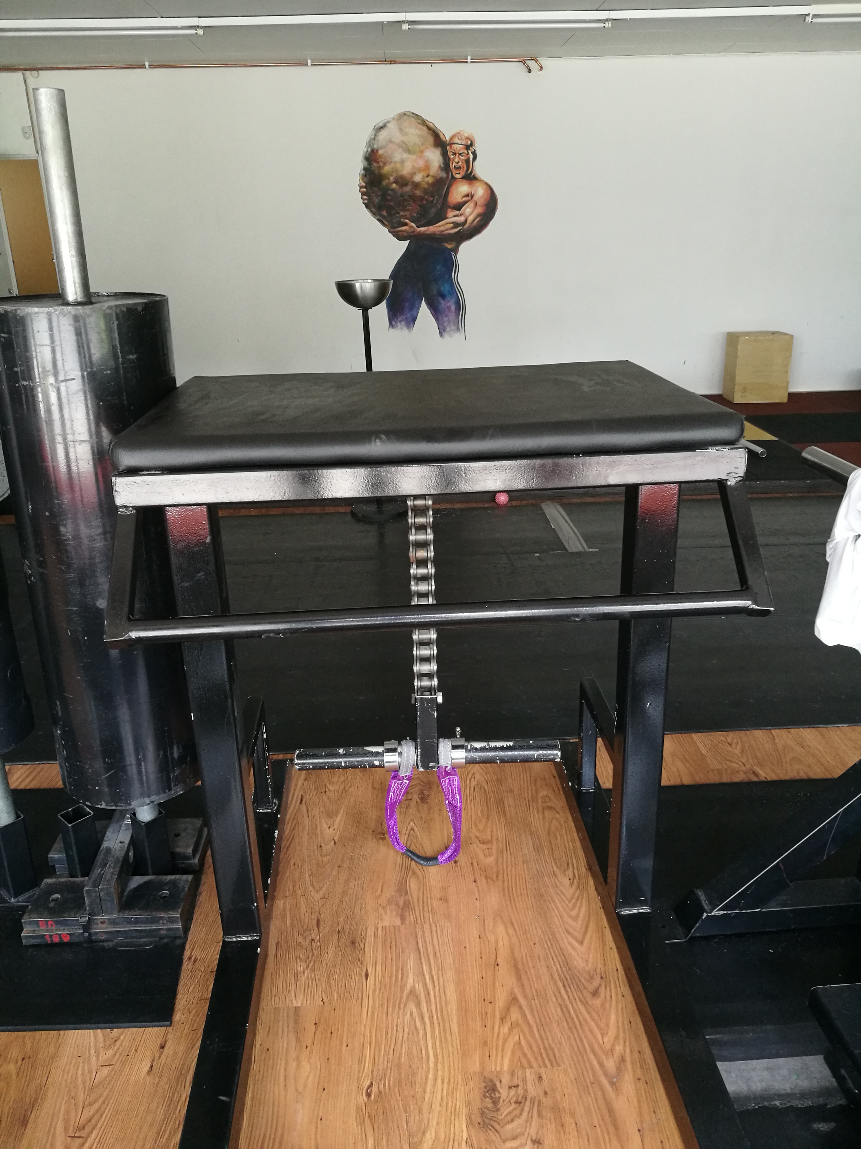 Kyseinen laite on meillä jo pitkään ollut hankintalistalla, syystä tai toisesta se on kuitenkin jäänyt aiemmin hankkimatta. Tosin tein jo varmaan seitsemän vuotta sitten itsekin kyykkyhäkkiin eräänlaisen virityksen. Laite maksaa uutena kaupasta ostettuna reilusti yli tonnin ja näitä ei pahemmin käytettyinä ole tullut vastaan. Nyt kuitenkin viikko sitten vanhaan jättämääni ostoilmoitukseen vastattiin, että Janakkalassa olisi laite varsin sopuisaan hintaan myynnissä. Pyysin laitteesta kuvat ja huomasin kyseessä olevan ns. ketjumalli, mitä muun muassa Donnie Thompson pitää ”ainoana oikeana” mallina. Sovin kaupat ja kävin seuraavana päivänä hakemassa laitteen meille Colosseumille. Janakkalan pojilla oli komea kellarisali vanhassa pommisuojassa, siinä taas vinkki jos haluaa harrastaa saliturismia kotimaassa.