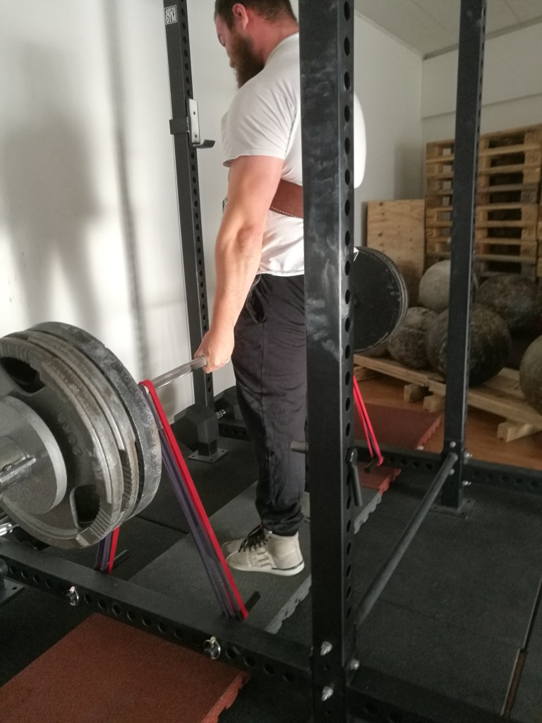 Kolmantena otetaan käsittelyyn vetokumit. Vetokumeja voidaan käyttää kuten ketjuja. Niitä voidaan käyttää myös monipuolisesti lämmittelyssä tai tehdä osa liikkeistä pelkästään vetokumien antamalla vastuksella. Tankoon kumit voidaan asentaa kahdella tapaa. Joko niin että kumit keventävät kuormaa alhaalla tai vastaavasti lisäävät kuormaa yläasennossa. Ensimmäisenä mainittu tapa onnistuu esimerkiksi kyykyssä niin, että laitetaan kumi roikkumaan power-rackin yläosasta ja tästä levytankoon. Mitä alemmas tanko lasketaan sen enemmän kumit venyvät ja auttavat. Jälkimmäinen taas onnistuu hirttämällä kumit painaviin käsipainoihin tai power-rackin pohjaan ja siitä tankoon. Tällä tyylillä kiinnittämällä kumit toimivat samalla tavalla kuin ketjut. Niissä on kuitenkin yksi ratkaiseva ero ketjuihin verrattuna. Siinä missä ketjut vain roikkuvat tangosta, esivenytetyt kumit koittavat vetää sinut lattian läpi. Tästä on seurauksena nopeampi eksentrinen vaihe. Nopeamman alaslaskun seurauksena taas saavutetaan suurempi kineettinen energia (kineettinen energia = 1/2 mvpotenssiin kaksi, miten tämä liittyy mihinkään se jääköön ensikertaan koska tällä blogitekstillä alkaa olla jo pituutta).